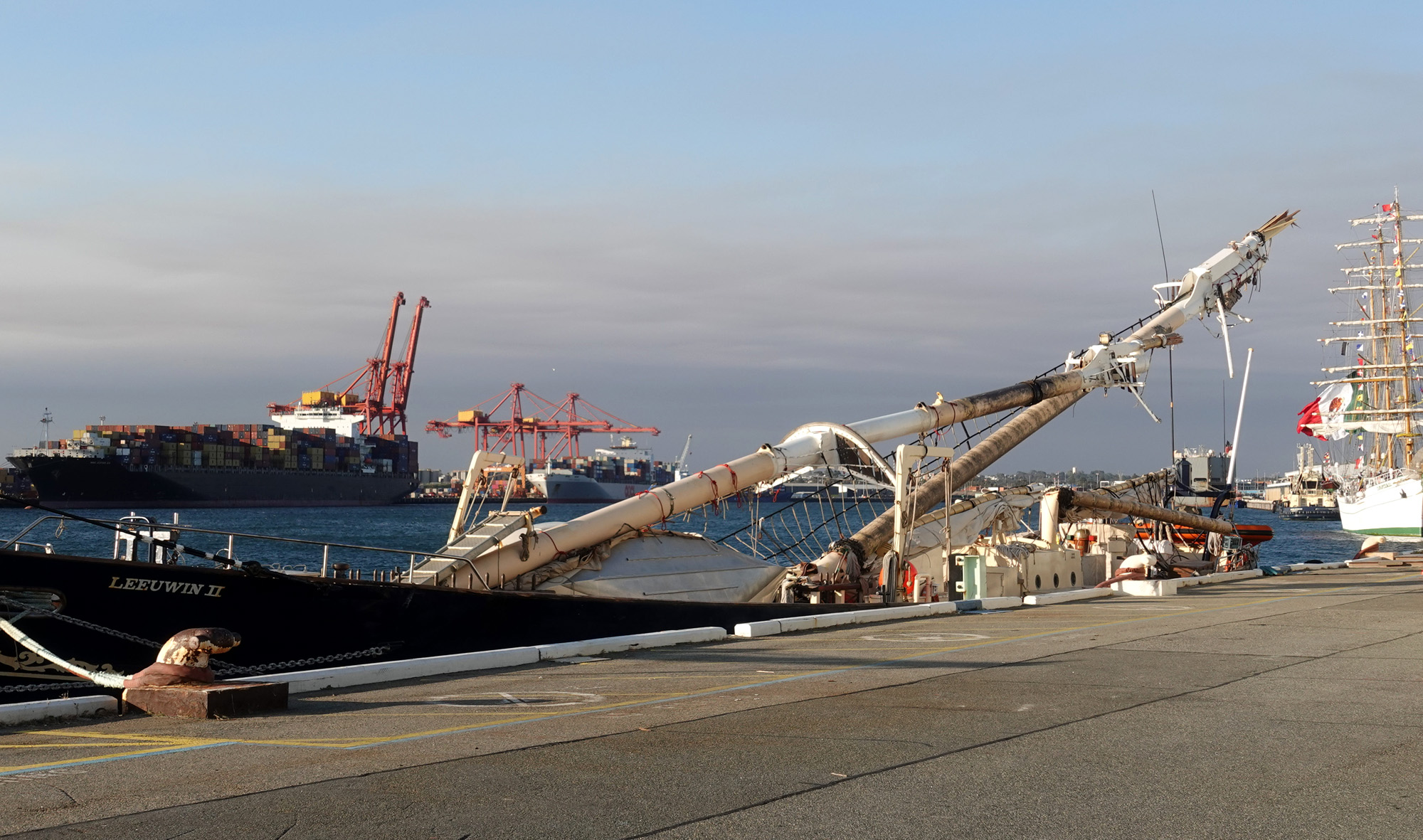 O tym wypadku mówił cały świat (pisaliśmy również my – tutaj). Nad ranem 30 sierpnia 2024 roku, w trudnych warunkach – przy silnym wietrze i intensywnym deszczu – wchodzący do portu we Fremantle kontenerowiec Maersk Shekou uderzył w cumujący przy nabrzeżu żaglowiec Leeuwin. Efekt był natychmiastowy – wszystkie trzy maszty barkentyny runęły na pokład. Na statku przebywały dwie osoby pełniące wachtę portową. Obie trafiły do szpitala z obrażeniami niezagrażającymi życiu. Biorąc pod uwagę skalę zniszczeń, można mówić o dużym szczęściu.